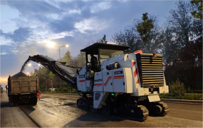 夕陽西下,華燈初上。G327國道路面翻新工程,5公分瀝青面層銑刨,行走速度可達(dá)20m/min左右。